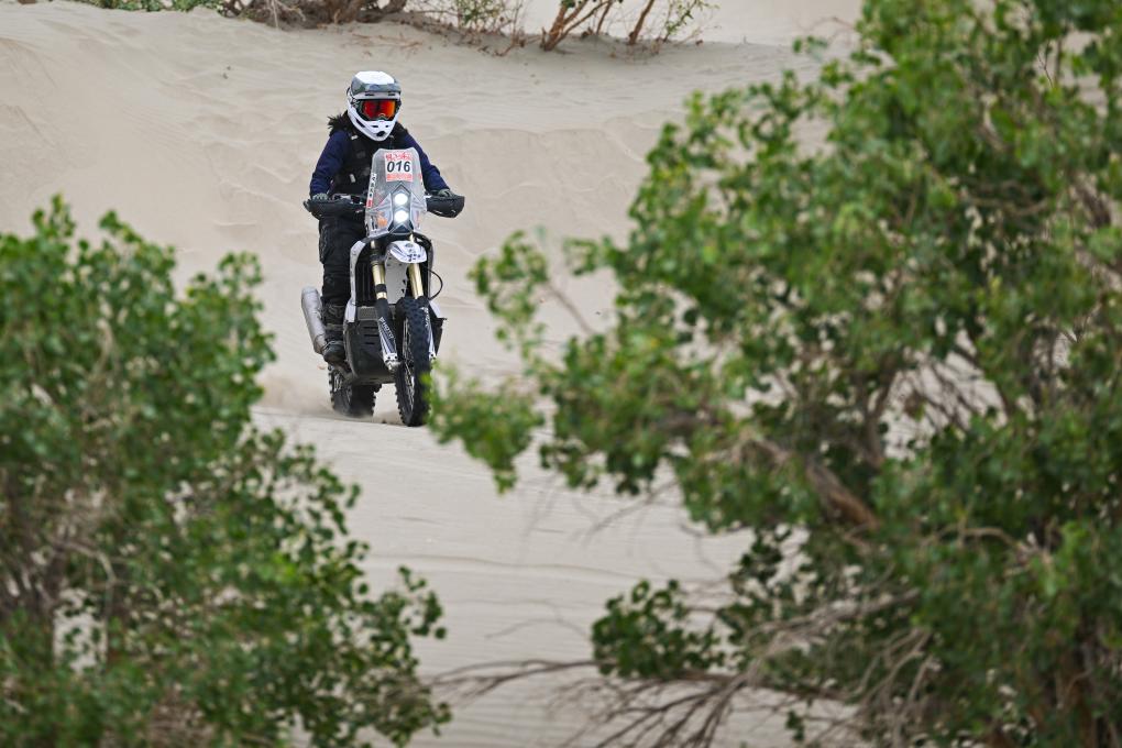 女摩托车手李艺斐已是第三次参加环塔拉力赛,在数次经历摔车、陷车、迷路等困境后艰难完赛。她说:“能够完赛还是挺开心的,环塔对于我来说已不只是比赛,在这里能见到许多给我温暖和鼓励的老朋友,期待明年还能再见大家。”